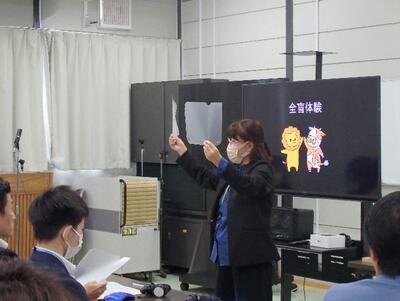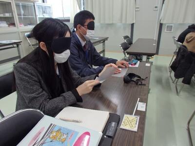 また、スライドを用いて学校紹介や視覚障害の説明を行ったり、アイマスクや弱視レンズを着けて視覚障害体験を行ったりしました。そして、「じっくり触って観察することの重要性を知った」、「声掛け(音声での説明)の大切さが分かった」との感想をいただきました。
