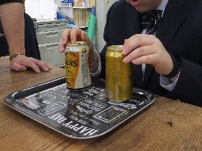 商品の工夫として、シャンプー・ボディーソープの印や牛乳の「切り欠き」は、使うときや買うときに触ってすぐに分かりやすいし、アルコール飲料の「おさけ」の点字表記は、間違っては大変だから確実に表記してあることが分かりました。調味料関係は、ケチャップ、ソース、コンソメ、あぶら、ドレッシングなど、さまざまな点字表記があることを知りました。それ以外では、パックご飯や木工用接着剤、冷却スプレーなどにも点字表記を見つけました。