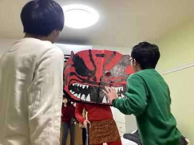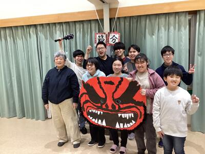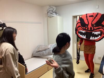 夜には、とても大きな顔の赤鬼が登場し、各部屋を回りました。舎生たちは思い思いの掛け声で鬼を追い払い、にぎやかで楽しい夜となりました。