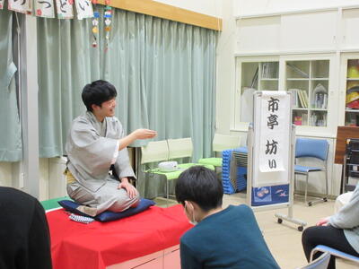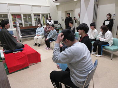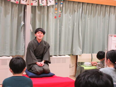 新年1月14日(水)、寄宿舎にて「新春のつどい」が行われました。行事に合わせ、その日の夕食は「年明けうどん」という縁起の良いメニュー。おいしくいただいた後は、東北大学学友会落語研究部から学生さんをお招きし、落語を披露していただきました。“市亭坊ぃ”さんと“雲鳴家丘割”さん、それぞれ巧みな話術に身振り手振りを交えて会場内が笑いに包まれました。生徒からは「表現が面白かった」「これまでも落語に触れたことはあったが、理解が難しかった。今回は、話の内容がスーッと入ってきて情景がイメージできた」という感想が聞かれ、普段は味わうことができない楽しい時間になったようです。
